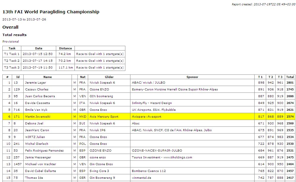 Martin Jovanoski was 6 place after task 3 on 13 FAI World Paragliding Championship -