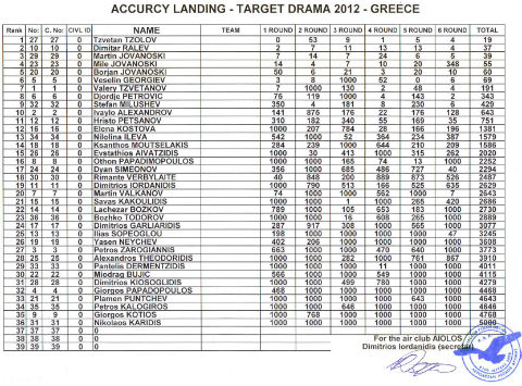 Na 3-4 noemvri 2012 vo sosedna GRCIJA , 140 km istocno od SOLUN , vo gradot DRAMA se odrza Megunarpden paraglajderski natprevar vo Paraglajderstvo vo disciplina Precizno Sletuvanje , a voedno za GRCITE prestavuvase DRZAVEN SAMPIONAT. Zemaja ucestvo blizu 40 - piloti na paraglajderi od 5 drzavi : SRBIJA ,BUGARIJA ,LITVANIJA, MAKEDONIJA i domakinot GRCIJA.